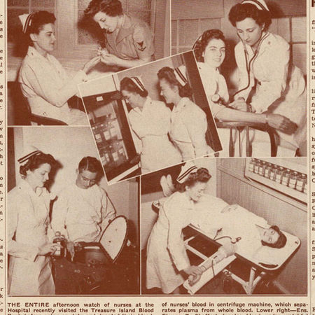 Advancements in blood transfusion technology, such as the extraction of plasma and new storage techniques, made blood donation essential in saving lives during WWII. The Red Cross set up a blood bank at NSTI to collect blood and plasma from personnel. Embarking sailors were sent aboard ships with their own blood and plasma, collected at the TI blood bank.